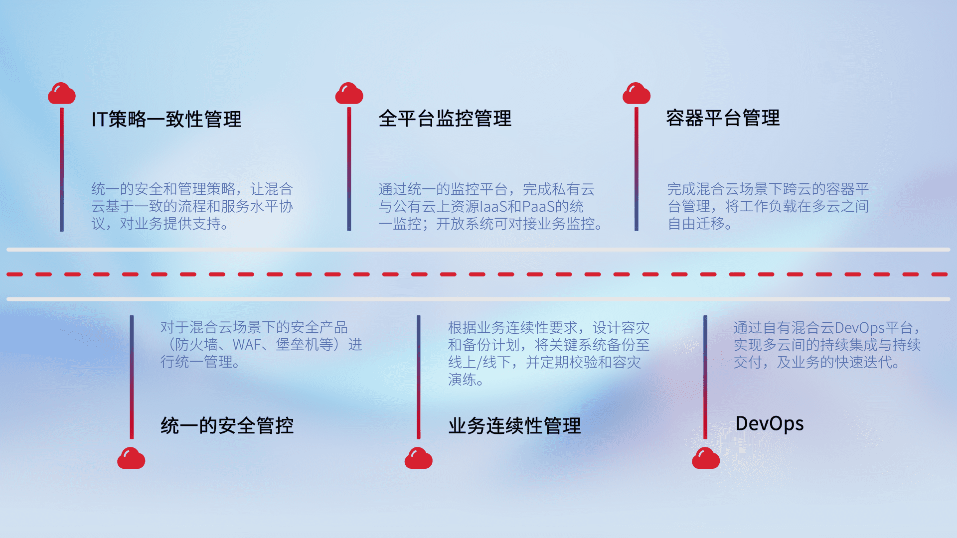 通过多云纳管,,以统一的资源数据模型把客户的云资源进行抽象和封装,,,,进而实现对多云资源的统一操作,,,,保障云资源管理的可靠性、、稳定性与可用性。。量身定制化运维内容,,,配置、、开发运维、、、补丁管理、、、备份、、监控、、、认证和访问管理、、审计和日常巡检等,,,保障在用云过程中的可靠度,,,稳定度以及高可用率。。
